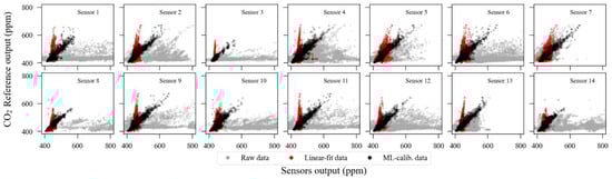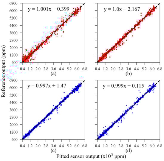 The linear relationships between each sensor unit’s validation subset calibrated using the machine learning algorithm and the reference output are presented in Figure 10. All sensors presented very high linearity after calibration. The residual error scattered throughout the dashed dark line is a visualization of the error’s parameters presented in Table 2. For example, in Figure 10, one can note that the red dots, representing the MOS sensors, are more scattered than the blue dots, representing the NDIR sensors; that is, the overall error observed in MOS sensors’ output was higher than in NDIR sensors’ output.