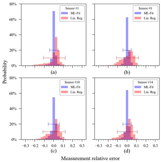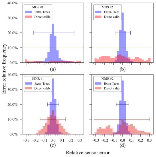 Figure 11, in turn, shows a histogram comparison of the performance achieved using the ExtRa-Trees algorithm versus the performance achieved using the unidimensional curve calibration model. The graphs were built using the relative error of each sensor and each bin has its width corresponding to 2.5% of the relative sensor error. The horizontal lines annotated on the graph correspond to the 95% confidence interval. Note that the MOS sensors with direct calibration showed a confidence interval higher than the axis limits, which means that the unidimensional calibration (annotated as “direct calibration”) for these sensors was ineffective in terms of accuracy enhancement.