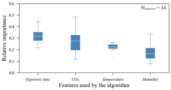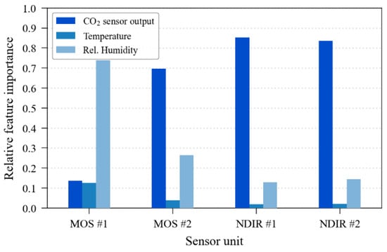 In terms of environmental dependence, disregarding MOS sensor unit 1, the sensors did not show significant interference from temperature within the range observed in the indoor experiments (Tmin = 20 °C and Tmax = 25.5 °C), probably due to the sensors’ auto-compensation feature. On the other side, relative humidity, which varied from 17.2% to 60.5%, seemed to affect the sensors more, as the feature importance plot indicated that its relative importance was above 20% for MOS sensors and above 10% for NDIR sensors. This finding suggests that for a high-accuracy application for CO2 monitoring using sensors with the technologies evaluated in this experiment (metal oxide semiconductor and non-dispersive infrared), a proper humidity measurement might be required in the vicinity of the carbon dioxide sensor. Concerning MOS sensor unit 1, despite the irregular behaviour of this unit (as seen in Figure 26), probably caused by a malfunction of some internal component, the ML model was able to extract information from its poor-quality outputs through identifying that the relative humidity was the most interfering parameter and compensating for this interference.