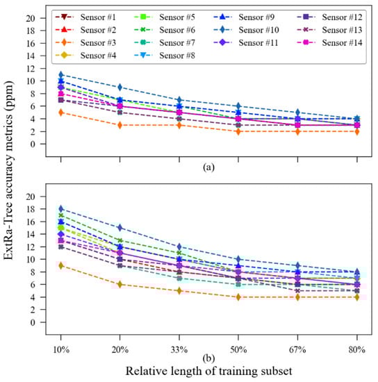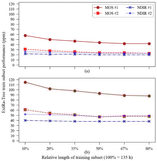 Concerning the ExtRa-Trees algorithm, the ML model was able to remove any systematic error (bias) from the sensors as well as significantly reduce the random error. Thus, the overall accuracy was satisfactorily enhanced, with mean absolute error reductions varying from 53% up to 93%, and RMSE reductions from 33% up to 91%, compared to the one-dimensional regression metrics. A summary of the improvements obtained using the ExtRa-Trees model in the accuracy parameters is shown in Table 8. These results were achieved using the model when trained with about 27 h of data (a relative size of 20% of the entire dataset). An increase in the training subset length, as previously presented in Figure 14, may benefit the MOS sensors’ accuracy enhancement, but there is a saturation point (limited by overfitting). This limit appears to happen around 90 h of training data for MOS sensor unit 1 (2/3 of the total dataset) and around 67 h for MOS sensor unit 2 (1/2 of the total dataset). The NDIR sensors seemed to be at the accuracy enhancement cap, as the training subset length showed no significant increase in the parameters presented in Table 8.