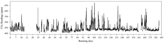 The NDIR sensors, which were previously calibrated using their automatic one-point calibration feature, used in fresh air to detect the 400 ppm level, have their raw response curve (also using 20% of the dataset, randomly chosen by the algorithm) depicted in Figure 7. The time series containing the carbon dioxide readings from the reference instrument, used as the target dataset, is presented in Figure 8.