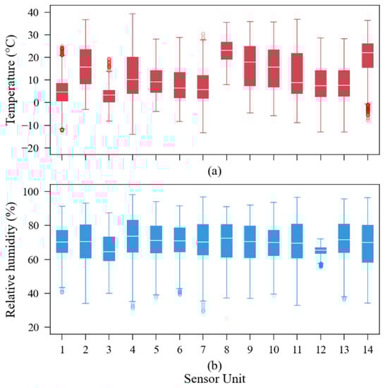 Boxplot of all (a) temperature and (b) humidity readings of the fourteen sensor units evaluated in the third-party dataset.