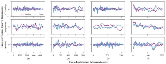 Regarding the machine learning algorithm, the data split process which separates the datasets between training and validation data subsets was designed differently from the common way. Although the experimental data are limited in time, these sensors were exposed outdoors for a significant time and we noted that the input parameters were not homogeneously distributed over the observation time. We assume the uncalibrated sensor error is a function of four variables: carbon dioxide, air temperature, relative humidity, and exposure time. Using, thus, a continuous range of data to train the model may not include all combinations of climatic variables existing throughout the dataset (e.g., imagine a calibration model being trained with data collected during winter and being tested over data gathered during spring). To circumvent this heterogeneous distribution of input parameters, the collection of points used for training the calibration models occurred randomly throughout the entire dataset. Aware of the risk of implying a dependency between training and test data, we reduced the size of the training dataset to 20% of the total to avoid creating two correlated datasets. Figure 18 demonstrates the cross-correlation between training and test subsets in two situations: the training dataset created with 20% of random points and when the training dataset was created with 80% of continuous points from the beginning of the time series. Considering that there was no consistent strong correlation between the datasets, we assume that we created an independent dataset for testing the model. However, some spurious correlations appear occasionally. We assume that this occurred due to the periodicity of the weather. Moreover, from this point on, we have chosen to present only the data of four sensor units to keep data visualization clearer, reducing the number of subplots and yet ensuring a closer look into the graphics. The sensors chosen for visualization were units 1, 8, 10, and 14. They were chosen randomly between those that presented the highest MAE values in raw conditions (>100 ppm). Those are the sensors with the most critical accuracy issues.