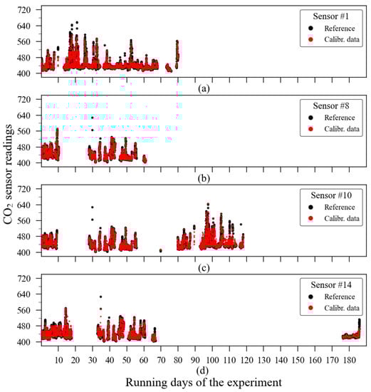 For comparison purposes, the calibration model of the experiment’s authors reached an overall error (averaged MAE from all sensor units) of 10 ppm for the carbon dioxide sensors. Moreover, their method was focused on a multi-pollutant platform and used 80% of the dataset as training in k-fold cross-validation (k = 5). They used different gas sensor data as inputs to detect eventual cross-sensitivity. Our method, in turn, was focused only on the carbon dioxide sensor data. Thus, we managed to reach a satisfactory accuracy even after reducing the data complexity through removing variables corresponding to other pollutants (reducing, consequently, the computational cost). In a similar manner, we found that sensor exposure time is also an important variable to be used as an input parameter in the algorithm for long-run calibration, since we managed to reduce the 95% confidence interval of the relative sensor measurement error to the range of ±2.4–5.8%, depending on the sensor unit, whilst this interval, assessed under the same circumstances, was ±7.5–13.3% with linear regression and ±4.4–8.7% with machine learning calibration without considering the exposure time.