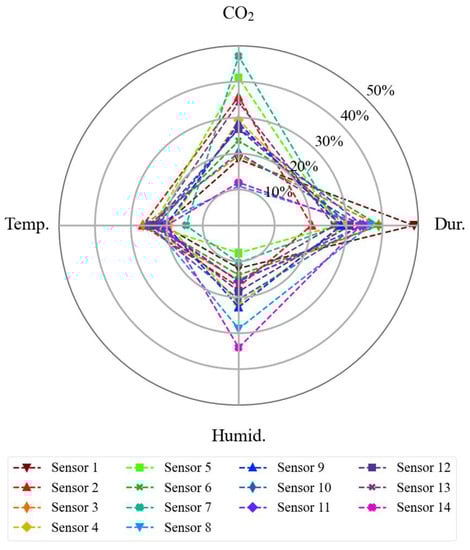 To prepare each sensor dataset to be used by the algorithm, it was necessary to overlay the data availability of each sensor unit with the reference sensor through its timestamps, avoiding using input data without target data, or vice versa (see Figure 3). As the SST CO2S-A sensor also provides temperature and relative humidity readings together with the carbon dioxide readings, it was not necessary to take any additional action towards these features regarding data preparation. All the temperature and relative humidity readings of the fourteen sensors are summarized in Figure 17. Some sensors were exposed to higher environmental variations than others, for example, sensor unit 4 versus sensor unit 8 in terms of temperature, or sensor unit 4 versus sensor unit 12 in terms of relative humidity.