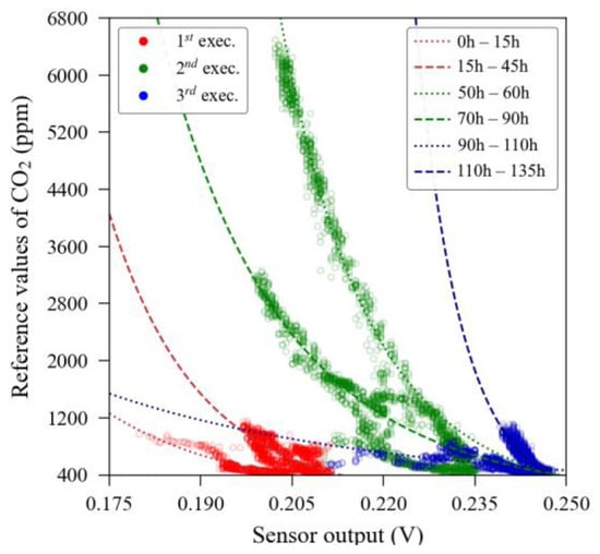 Unidimensional regression, either linear or non-linear, is the first calibration method that the end-user might resort to when a reference instrument is available because it is a straightforward process. We observed that the unidimensional calibration using only the reference as a guide dataset may be able to enhance linearity and reduce errors in significant quantities (up to 60% of MAE reduction, as observed in the validation dataset of NDIR sensor unit 2), but it still keeps a significant error spread, as one can observe in Figure 10, where the best sensor performance—NDIR unit 1—still kept 95% of its relative errors contained around the mark of ±15% (relative to the actual measurement). The MOS sensors presented a much more critical error pattern, with their 95% interval of relative errors exceeding the ±30% mark for both sensors. This occurs, perhaps, due to the significant dependence on climatic variables of the MOS sensors. Moreover, we also observed that the accuracy of direct unidimensional calibration models, whether linear regression or inverse power law relationship, did not change regardless of the variation in the size of the training subset within the evaluated intervals, maintaining the accuracy values presented previously in Table 1 for all training subset sizes. However, this training model was obtained from random points distributed alongside the dataset. This occurred to maintain the most of the sensor characteristics as possible. For example, if the data points for training were collected from a continuous part (e.g., the first 20% of the dataset), the performance of the MOS sensors could deteriorate, because it would lack information contained in the hysteresis-like curve observed when CO2 concentrations were high (the MOS sensors presented one curve response when CO2 concentrations are rising and a different one when the CO2 concentration is diminishing). Moreover, the MOS sensors showed to be more susceptible to environmental interference. Figure 28 illustrates in detail this anomalous behaviour, where each colour corresponds to the data obtained from a different experimental execution. Note that there are six major patterns for this sensor, each one represented by a fitted curve using an inverse power law relationship.