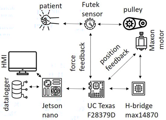 Proposed general architecture. The prototype consists of two electronic cards. the Jetson nano sends the setpoint parameters selected in the interface to the microcontroller (UC) Texas F28379D, and stores the values generated by the controller and the sensors. The H-bride transforms the PWM signal generated by the UC into a voltage to move the motor. The interaction between the patient and the motor is detected by the Futek load cell sensor.