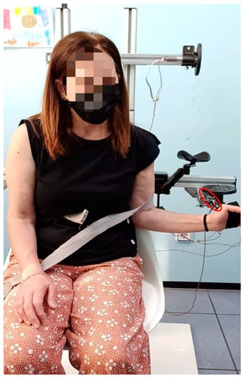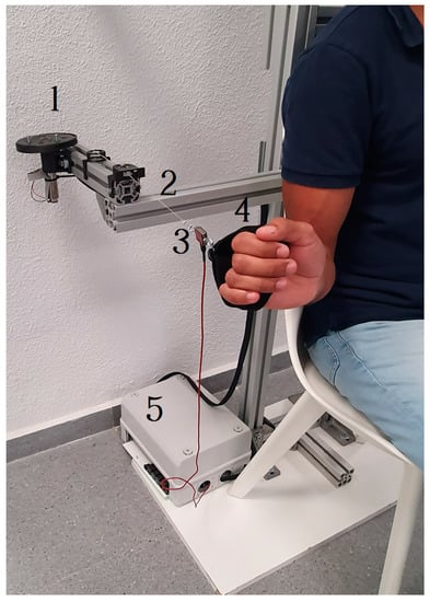 The patient’s hand is positioned inside the handle, which is made of a flexible textile for a comfortable grip. Figure 2 shows an image with all the components. The patients sit in a chair, and the described components are mounted in an aluminum structure that provides a comfortable workspace.
