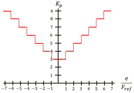 In this work, a force controller is proposed based on the cable tension exerted by the patient and an adaptive speed PI controller. The force sensor provides a range of detection from 0 N to 111 N; therefore, the maximum configurable payload of the prototype is 11.32 Kg. The proportional gain Kp is modified as a function of the ratio between the force error and the reference; the proposed values are shown in Figure 3. The integral gain Ki was set at a value of 2. Kp and Ki were tuned experimentally.