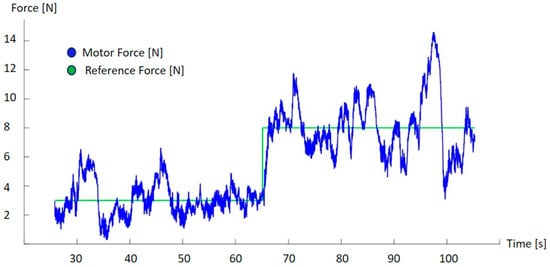 Evolution of the force exerted by the motor according to the force reference. Oscillations over the reference are due to the interaction with the patient to account for differences in resistance during the movement.