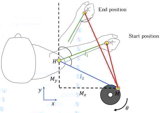 To perform the rotation movements, the patient started the external rotation movement from the initial position up to the maximum rotation they were able to achieve. In this half-cycle, the patient exerted a force greater than that generated by the motor. In the second half of the cycle, when the patient returned to the initial position, performing an internal rotation; this movement was in the opposite direction and the force applied by the motor was greater than that exerted by the patient. Figure 6 shows the limits of the cyclical movement. The force reflected by the actuator was fixed throughout the cycle and measured by the load cell. This load cell was located close to the patient’s hand to obtain an accurate estimate of the force reflected on the patient; otherwise, the forces caused by friction might affect the information processed by the controller.