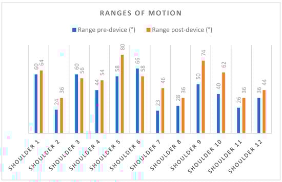 Ranges of motion after one rehabilitation session. A total of 10 out of 12 shoulders present improvements, while 2 present slight deteriorations, likely due to lack of familiarity with the device.