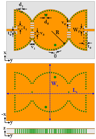 In [14], higher-order modes of substrate-integrated waveguide (SIW) bandpass filters were suppressed using a multi-layer method. The demonstrated apertures engraved on the middle metal layer allowed the vertical coupling of rectangular SIW resonators on multi-layer substrates through magnetic and/or electric coupling. In [15], SIW filter development was demonstrated on and off, with its operational frequency range switchable between the S-band and the X-band. In [16], a bandpass filter with a broad upper stopband and a weaker electric field was created using the fundamental mode of post-loaded substrate-integrated waveguide (SIW) resonators. The SIW coaxial cavity was used to construct both narrow-band and wide-band BPFs, as shown in [17]. The investigation and realization of QMSIW filters were recorded [18]. Triple-mode bandpass filters (BPFs) utilizing a substrate-integrated waveguide (SIW) square cavity loaded with CSRRs were developed [19]. In reference [20], a compact bandpass filter (BPF) with a broad stopband response was achieved by utilizing a combination of microstrip and substrate-integrated waveguide (SIW) technologies. Half-mode substrate-integrated waveguide (SIW) cavities were utilized in the design of bandpass filters (BPFs) in reference [21].