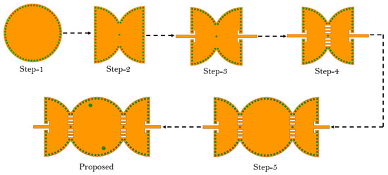 The architecture of the proposed third-order bandpass filter is depicted in Figure 1. The proposed BPF was configured using two microstrip feed lines, semi-circular SIW cavities, capacitive slots, and inductive vias. The evolution of the proposed model is depicted in Figure 2, which shows six successive transformative phases.