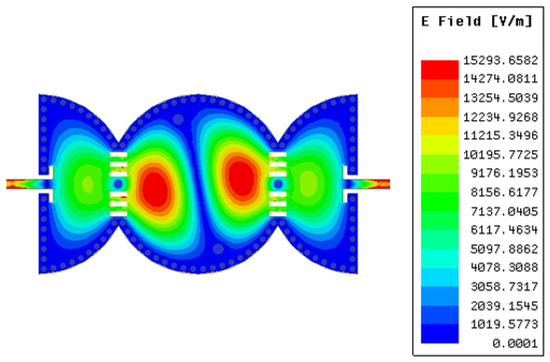where c is the speed of light in a vacuum; R is the equivalent radius of the substrate-integrated circular cavity (SICC); and denote relative permeability and relative permittivity of the substrate, respectively. Subsequently, the cavity is bisected into two halves along the region of zero electric or magnetic field, also known as the field of null. The frequency of operation of the cavity does not change significantly even upon bisection, as the bisecting line does not interfere with the electric field distribution of the cavity. The resulting halves are then cascaded in reverse order, as illustrated in Step 2. Two 50 Ohm microstrip lines feed the input and output of the filter. In Step 3, the cascade structure enables the modes to couple, owing to the overlapping cavities at the junction, resulting in a two-pole filter. When the slot lines are placed in the coupling window (as in Step 4), they alter the electric field distribution and increase the coupling between the two adjacent cavities. This effect is due to increased electric field intensity in the slot line region. The simulated S-parameters of the circuit design in Steps 3 and 4 are shown in Figure 3. To create a three-pole filter, the design obtained in Step 4 is cascaded back-to-back, and the vias are removed from the center of the newly formed structure (as in Step 5) to allow for wave propagation. Finally, the introduction of two inductive vias into the circular center cavity generates a transmission zero in the upper stopband. The diameters d of the vias and their spacings S are chosen by applying the following criteria: and . This is to keep the radiation losses reasonably low. The coupling topology of the proposed circular SIW filter is illustrated in Figure 4. Figure 5 shows the E-field distribution of the proposed model. The electromagnetic field (EM) simulator was set up with a value of one watt for the incident power. We already know that the power density, referred to as the rate of energy transfer per unit of area, is the product of the electric field strength (E) and the magnetic field strength (H). Inside the full-mode circular cavity, where the strength of the magnetic field is relatively low, the highest electric field is measured to be 15 kilovolts per meter, as depicted in Figure 5.
