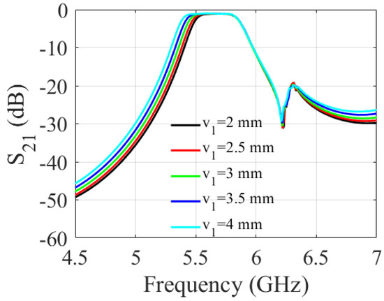 A three-stage stepped impedance resonator was used to provide transmission zeros and practical stopband responses in this filter. As illustrated in [35], a narrow-band bandpass filter may be built using an inline HMSIW cavity. This filter improves selectivity by producing quasi-elliptic responses through interdigital slots, which provide restricted transmission zeros. In [36], a 6 GHz bandpass filter working in a rectangular SIW cavity was created for 5G networks. This filter uses D-shaped resonators to provide compactness and a broad stopband response. In [37], the authors detailed the construction of a bandpass filter using a rectangular SIW cavity packed with an array of mutually reinforcing split-ring resonators. The stopband response of this filter was between 6.4 and 7.8 GHz, and the fractional bandwidth was 30% larger than the total bandwidth. The insertion loss of this filter was 1.5 dB. In [38], a SIW cavity was utilized to make a dual-frequency bandpass filter by loading it with a combination of right- and left-handed transmission lines and complementary split-ring resonators. The filter had a bandwidth of 3% at its 5 GHz resonant frequency and 4.2% at its 7.5 GHz resonant frequency. In [39], a tunable bandpass filter was reported, which used a SIW hexagonal resonator. Insertion loss was 2.01 dB, and fractional bandwidth was 2.92% for this filter. Two resonators and three inverters combined to create a SIW bandpass filter, as described in [40]. The design and development of a bandpass filter utilizing a substrate-integrated waveguide (SIW) cavity with iris resonators was elaborated on in reference [41]. The aforementioned filter has the capability to operate at a frequency of 9.77 GHz, exhibiting a fractional bandwidth of 12.17% and an insertion loss of 1.19 decibels. To obtain comprehensive responses, the study conducted by reference [42] demonstrates the design of a bandpass filter using a substrate-integrated waveguide (SIW) cavity that incorporates a defective ground structure. The aforementioned filter demonstrates a reduced footprint through its passband range of 3.0 GHz to 11.0 GHz, an insertion loss of 1.2 dB, and the inclusion of a notched band. In a previous study [43], a narrow bandpass filter was achieved using a rectangular substrate-integrated waveguide (SIW) cavity that incorporated inductive posts on its upper surface. The given filter exhibited a center frequency of 12.2 GHz, an insertion loss of 1.22 dB, and a fractional bandwidth of 1.475%. The authors constructed a dual-mode bandpass filter in reference [44], employing a substrate-integrated waveguide (SIW) cavity filled with cross-shaped slots. The filter exhibited a fractional bandwidth of 9.1% at a frequency of 7.5 GHz. Additionally, it had two transmission zeros located at frequencies of 12.5 GHz and 15 GHz, respectively. The authors of [45] used a rectangular substrate-integrated waveguide (SIW) cavity and stepped impedance resonators to create a compact bandpass filter. The filter operated at a frequency of 4.8 GHz, possessed four transmission zeros, and exhibited a fractional bandwidth of 13%. Its footprint was 0.3 . A dual-mode bandpass filter at 5.8 GHz was created using a SIW cavity loaded with a circular patch slot [46]. The authors of [47] utilized a SIW cavity in the non-resonant mode to create a bandpass filter that offered a high degree of design flexibility. The SIW cavity had two rectangular complementary split-ring resonators [48]. The filter’s bandwidth at 3 dB was 320 MHz, its insertion loss was 2.4 dB, and its transmission zero was 5.9 GHz.