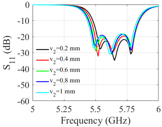 A parametric study was carried out to determine the impact of the slot dimensions on the filter performance. It involved varying the length and width of the slot and observing the resulting changes in the S-parameters of the filter over a range of frequencies. As shown in Figure 6 and Figure 7, increasing the slot length () enlarges the filter bandwidth. The 3 dB fractional bandwidth increased by 27% when () varied from 2 mm to 4 mm. The results shown in Figure 8 and Figure 9 indicate that increasing the slot width enhances the filter bandwidth. Altering () from 0.2 mm to 1 mm increases the 3 dB fractional bandwidth by 15.6%. Based on the trade-off between the return loss and bandwidth, the filter’s optimal slot lengths and widths were determined to be 3.5 mm and 1 mm, respectively.