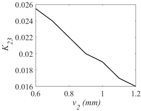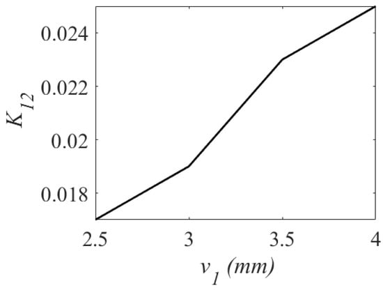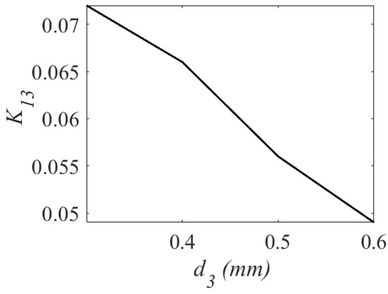 Applying the eigenmode analysis, the unloaded quality factor is computed as 256. For verification, a third-order BPF was synthesized. Figure 10 shows the variation of the coupling coefficient with respect to the . Figure 11 shows the variation of the coupling coefficient with respect to the , and Figure 12 shows the variation of the coupling coefficient with respect to the . The parameters , , and control the values of the main coupling coefficients ( and ) and the cross-coupling coefficient () in Figure 10, Figure 11 and Figure 12. As shown in Figure 10, when increases from 2.5 mm to 4 mm, shifts from 0.018 to 0.024. When changes from 0.6 mm to 1.2 mm, changes from 0.026 to 0.016. As illustrated, the cross-coupling coefficient decreases from 0.07 to 0.05 when the value of increases from 0.2 mm to 0.6 mm.