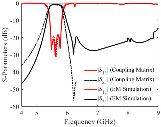 EM-simulated S-parameters of the third-order BPF versus the coupling matrix.