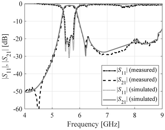 The proposed third-order BPF based on SICC is fabricated on a Rogers RO4003 substrate with a relative dielectric constant of 3.55, thickness h = 0.8 mm, and loss tangent tan = 0.0027. Figure 15 displays a photograph of the fabricated filter prototype. The simulated and measured S-parameters of the circuit are shown in Figure 16. The measurement results indicate a return loss better than 18 dB, an insertion loss of 1.1 dB, and a fractional bandwidth of 8.7%. The filter’s transmission zero is located at 6.2 GHz. Table 1 presents a comparison between the proposed BPF with state-of-the-art BPFs reported in the literature. The salient features of the proposed third-order bandpass filter are as follows: