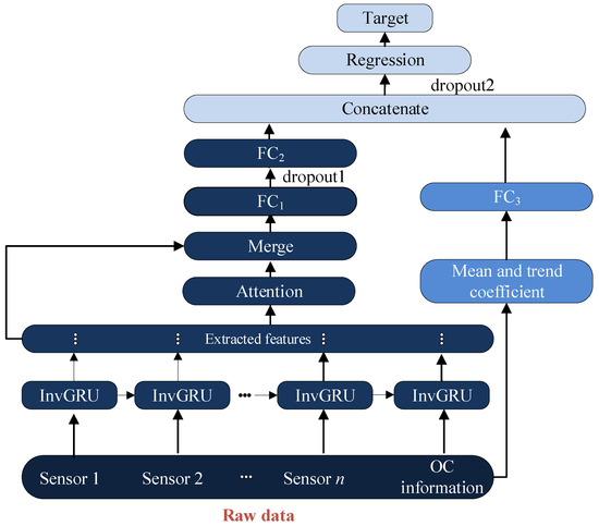 Based on the proposed InvGRU, a DL framework is adopted to estimate the aero-engines’ RUL. The framework diagram in Figure 4 integrates HIs from both neural networks (NNs) and human-made features, enabling a comprehensive approach to RUL prediction. First, InvGRU is employed to extract features based on multi-raw measurements, including multiple sensors’ data and engine operational condition (OC) information. The attention weights [39] are calculated by the obtained hidden features and combined with the hidden features, and the merged features are input into the following FC layers to generate the HIs from the NN. In the next step, commonly used handcrafted features such as the mean and trend coefficient are calculated from the raw data. The mean represents the average value of a window, while the trend coefficient corresponds to the slope coefficient derived from linear regression on the windowed time series. To obtain the HIs of human-made features, these handcrafted features are then fed into a new fully connected FC layer. Finally, HIs obtained from the neural network and human-made features are concatenated to form the HI set. This concatenated set is inputted into the regression layer, which predicts the RUL.