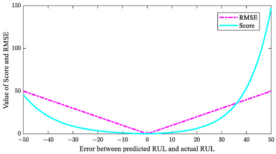 These metric values are inversely proportional to the RUL prediction performance. In other words, a lower value indicates better model performance. Score penalizes delayed predictions more heavily than RMSE, as shown in Figure 5, making it more aligned with engineering practices. Therefore, the score is more reasonable, especially when the RMSE values are close. In the figure, the vertical axis represents the value of RMSE and score, while the horizontal axis represents the errors between the predicted RUL and actual RUL.