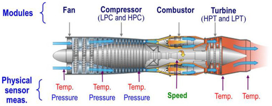 The C-MAPSS dataset, developed by NASA, simulates degradation data for turbofan engines, whose structure is shown in Figure 6. The C-MAPSS dataset can be divided into four subsets based on different operating conditions and fault modes, as described in Table 2. The 21 simulation outputs of C-MAPSS are listed in Table 3, in which ~, ↑ and ↓ represent the stable, upward and descend trends of the sensor measurements.