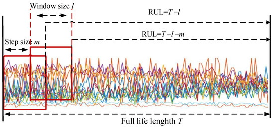 Firstly, not all sensor measurements are included as inputs in the RUL prediction model. Some stable measurements (sensors 1, 5, 6, 10, 16, 18, and 19) are excluded in advance. These sensor measurements contain limited degradation information of the engine and are not suitable for predicting the RUL. Additionally, operating condition information affects the predictive capability of the model. Therefore, the 14 selected sensor measurements and operating condition information serve as the final input for the model. Secondly, we segment the data using the technique demonstrated in Figure 7. T, l, and m represent the total lifecycle, the window size, and the sliding step, respectively. The size of the i-th input is l × n, where n represents the dimension number of the final input of the proposed model. The RUL at this point is Ts − l − (i − 1) × m. Based on the results of the experiments, the sliding window size l is set to 30 and the sliding step m is set to 1. Finally, the linear piecewise RUL technique is used to construct the RUL labels as follows: