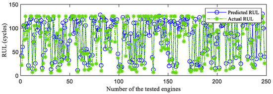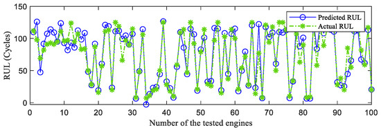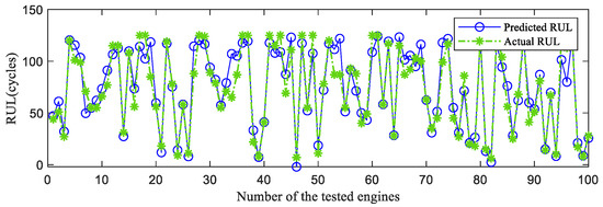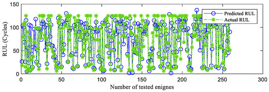First, the proposed InvGRU-based DL framework is trained using the training sets from all of the subsets. Then, the test set of the subsets is adopted to test the predictive performance of InvGRU-based DL framework. The prediction results are shown in Figure 8, Figure 9, Figure 10, Figure 11 and Figure 12. In the figures, the x-axis is the tested aircraft engine unit number and the y-axis denotes the RUL cycles. The predicted RUL and the actual RUL are represented by the solid blue line and dashed green line, respectively.