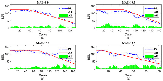To further show the InvGRU-based DL framework performance in predicting the RUL of individual engine units during the overall degradation process, four test engine units randomly selected from all subsets were used to showcase the full-life estimation process shown in Figure 12, Figure 13, Figure 14 and Figure 15. The blue line in the figures represents the predicted RUL (PR) of the engine unit, while the red line represents the actual RUL (AR). The green bars represent the absolute error (AE) between PR and AR for each cycle. Additionally, the mean of the absolute errors (MAE) between PR and AR across all cycles of the engine unit was computed to evaluate the average prediction error.
