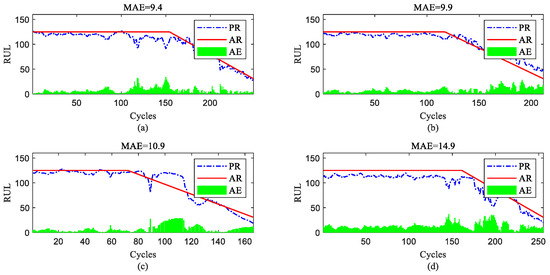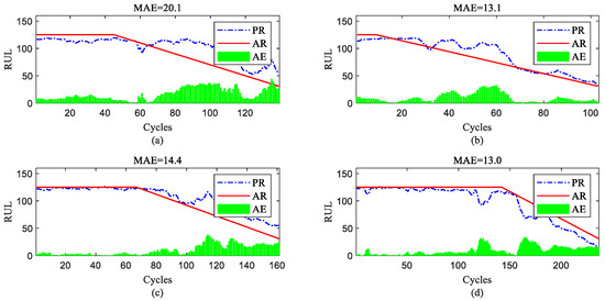 It can be observed from Figure 12, Figure 13, Figure 14 and Figure 15 that the predicted RUL of the selected test engine units closely aligns with the actual RUL, effectively revealing their degradation trends. Moreover, considering the average values of the MAE in Figure 12, Figure 13, Figure 14 and Figure 15, the average MAE on the FD001 dataset is 10.7, while the average MAE on the FD002, FD003, and FD004 datasets are 12.1, 15.2, and 11.3, respectively. This indicates that the proposed model exhibits significantly better RUL prediction performance on the FD001 dataset compared with the FD002, FD003, and FD004 datasets. As the number of engine cycles gradually increases, the degradation process begins to manifest and worsen. For most engines, the accuracy of predicting the RUL in the later stages of the degradation process tends to be higher than in the earlier stages. This is evident in Figure 12c, Figure 13a–c, Figure 14b,d and Figure 15a,c,d.