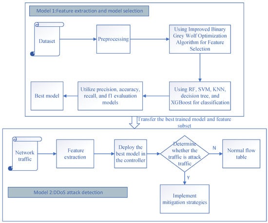 In module 1, the dataset is first preprocessed, and the optimal feature subset is obtained with feature selection using an improved binary grey wolf optimization algorithm; then, the selected feature subset is trained and tested using five supervised learning classifiers, namely, Support Vector Machine (SVM), Random Forest (RF), Decision Tree, XGBoost, and k-nearest Nearest Neighbor (k-NN) algorithms are used to train and test the selected feature subsets. Among them, the best-performing classifier is selected as the optimal classifier and finally deployed in the controller. Supervised learning was used because it offers several advantages, such as improving the clarity of the data and making training easier [30,31]. Subsequently, the optimal classification model and the best feature subset are passed to module 2. In module 2, network traffic is characterized and normalized according to the best feature subset. DDoS attack detection of SDN traffic is achieved by determining whether it is an attack traffic using the best classification model deployed in the controller. If any attack traffic is detected, the user is immediately notified, and the necessary mitigation strategies are implemented to ensure proper server functionality. If no malicious activity is detected, the flow table is usually dispatched.