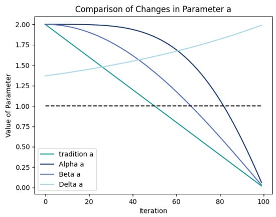 In order to better optimize the search performance of the Alpha, Beta, and Delta wolves in the GWO algorithm, different search parameters were designed, as shown in Figure 5. Specifically, extends the time when is greater than 1 to keep it more significant than 1 during the middle and later stages of the iterations.