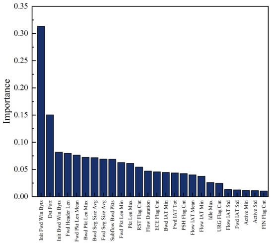 In total, 26 features were selected from the original dataset of 79 features using the algorithm mentioned above. The pseudo-code of our algorithm is shown in Algorithm 1. The results are displayed in Table 2. Furthermore, the algorithm’s selection process also identified the importance of each selected feature, which is illustrated in Figure 6.