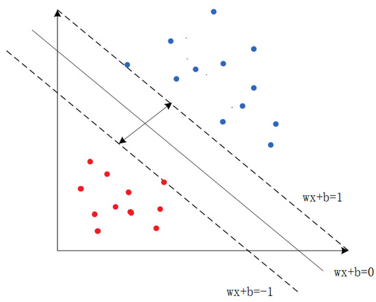 SVM is a binary classification model that separates data points of different categories by searching for a hyperplane (a straight line in 2D or a flat plane in 3D). Taking linearly separable data as an example, as shown in Figure 7, SVM aims to find the closest points to the hyperplane, which are called support vectors. In the figure, the red points represent negative instances, and the blue points represent positive instances. Support vectors are the points that satisfy the constraints.