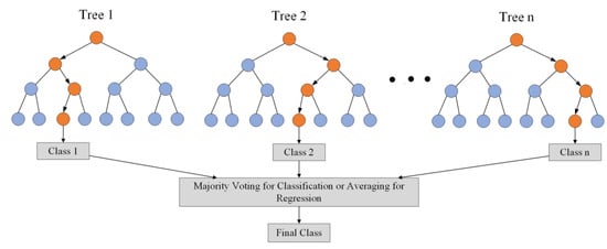 RF is an ensemble model comprising many decision trees, each trained on a different subset of the dataset. Although each decision tree is a weak classifier, they can achieve high accuracy when used together. When classifying or predicting new data samples using RF, each decision tree classifies the data based on its features, and the final result is obtained by either averaging or taking the majority vote, as shown in Figure 8. During the training process, each decision tree in RF undergoes independent sampling using Bootstrap and randomized feature selection. This approach avoids overfitting and improves the model’s stability and generalization capacity. Due to these characteristics, an increasing number of researchers use RF for both attack detection and regression problems [6,39,40].