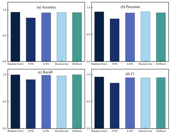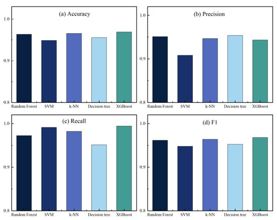 In this work, we have implemented five machine learning algorithms: RF, SVM, k-NN, Decision Tree, and XGBoost. All classification algorithms used default parameters and were trained and tested using K-fold cross-validation. According to work performed in the literature [49,50], a value of 10 for K is preferred. Figure 10 and Figure 11 show the performance metrics of each classifier on the original dataset and the dataset after performing feature extraction, respectively, where (a) accuracy, (b) precision, (c) recall, and (d) F1 score. See Table 3 for details of the classification results.