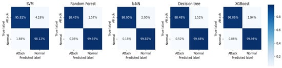 From the data analysis, we can see that the XGBoost algorithm had the best performance on the original dataset with an accuracy of 0.969. However, it was slightly less accurate than RF but had the best overall performance. After feature extraction, the accuracy of each classifier improved to a greater or lesser extent, with the Decision Tree algorithm improving the most, by 0.0341, followed by the RF algorithm by 0.0278, and the SVM algorithm, by the least, by 0.0202. Overall, except for the accuracy, which was slightly lower than that of the Decision Tree algorithm, the RF algorithm performed the best. The RF algorithm performed the best, except for the accuracy, which was slightly lower than that for the Decision Tree algorithm, and all other metrics were better than the other algorithms. In addition, Figure 12 and Figure 13 show the confusion matrix for each classifier on the original dataset and the dataset after performing feature extraction, respectively. The misclassification rate of each classifier decreased, with the RF classification algorithm performing the best. The RF algorithm performed the best in misclassifying normal traffic as attack traffic and misclassifying attack traffic as normal traffic. The AUC-ROC curves for all classifiers are presented in Figure 14, where SVM_AUC is 0.9696, RF_AUC is 0.9917, k-NN_AUC is 0.9891, DTC_AUC is 0.9898, and XGBoost_AUC is 0.99. Therefore, we consider the RF algorithm to be the best performer.
