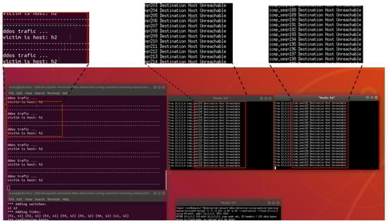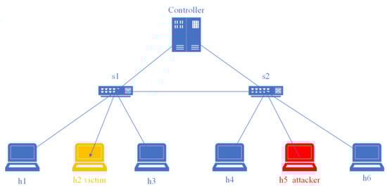 Figure 15 shows the network topology for this experiment, which includes a controller, two switches, and six hosts. h5 is the attack initiator, h2 is the victim, and h4 and h6 send normal traffic requests to h2. We first preprocessed the network traffic to extract the required features and then used the best-performing classification algorithm for DDoS attack detection. A notification was sent to the user if the traffic was identified as an attack; otherwise, the flow table was issued normally. As shown in Figure 16, when we used hping3 to launch a flooding attack on h2 using host h5, h4 and h6 could not send data requests to h2, and the controller alerted the user that h2 had received the attack. When the mitigation strategies (Algorithm 2) were activated, the traffic rule was configured to drop packets corresponding to a specific input port to achieve mitigation of the flood attack, and h4 and h6 could send data to h2 normally, as shown in Figure 17.