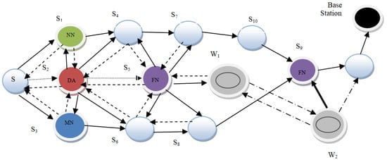 In the proposed architecture, a small part of the WSN, consisting of 15 sensor nodes, is considered. Out of these nodes, three nodes are designated as the Monitoring, Neighbouring, and Forwarding nodes (MNF), respectively. These nodes constitute a group known as the MNF group. The function of the monitoring node is to calculate the MAC of the data. The relaying and neighbouring nodes collaborate to verify the data generated by the monitoring node. The monitoring and neighbouring nodes record wormhole attacks as well. The DA gathers the information from every cluster, encodes it, and transmits it to a centralized controller, i.e., a base station. Every group’s forwarding node (FN) is also interconnected to the FNs of other groups. For fake information detection, each successive DA shares a symmetric key pair. Nodes W1 and W2 form a wormhole link in order to perform malicious activities such as packet dropping, data modification, routing misguiding, etc., as shown in Figure 1. The different colors of various nodes signify the nodes’ different functions; red is for the Data Aggregator node, purple is for the forwarding node, light blue is for the normal sensor node, dark blue is for the monitoring node, black is for the base station, and green is for the neighbouring node, respectively.