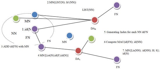 The steps followed in the MNF group formation are shown in Figure 2. In the first step, the DAn computes the MAC ID (NN) and adds in the MAC list of (NN). In the second phase, a whole message M is transferred across two DAs via FN. The message M comprises the necessary information: list (NN) and MAC ID (NN). Subsequently, the Group-A FN relays such M packets to another associated FN, which is situated amid two aggregators. The FN inserts its own ID in packet M at the third stage. M contains M list (NN); MAC ID (NN); and ID (FN) in the fifth step. The IDs of all interconnected NN and FN between the DA, DAc and DAn become available to the next DA and DAn. In the next phase, the existing DA and DAc index all NN and FN node IDs. Index 1 to h includes the IDs of NNs, whereas index 1 to s includes the IDs of FNs. The monitoring node evaluates the MAC IDs of the NN and FN in the next phase. Once the data are transmitted to the Backward DA (DAB) in the seventh step, the DAB receives M with the value list M (NN); ID (NN), h, s. The procedure is to cover all the nodes. Each group’s monitoring node (MN) attached to the DA chooses this index and makes determinations about its own group members using combined FN and NN IDs [].