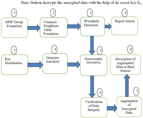 The IoT-based wireless Sensor network (WSN) is a revolutionary system for smart observation. An IoT-based Wireless Sensor Network (WSN) is defined as a number of spatially dispersed and dedicated sensors for observing and recording the physical conditions, such as temperature, humidity, etc., of the environment. The collected data are forwarded through a wireless network to an internet-based base station. The primary goal of data fusion or aggregation is to extend network life by reducing sensor network resource use, which includes batteries, power, and bandwidth [,]. Data aggregation techniques, on the other hand, could affect key quality of service measures in WSN, such as accuracy, speed, and failure []. Furthermore, data aggregation introduces new risks. A hacked sensor node, for instance, might either fraudulently release or broadcast the data it acquires from neighbouring nodes, or return random results as aggregated data. As a result, an opponent may violate both the secrecy and the integrity of the information over a broad section of the WSN by compromising a significant number of aggregating units near the base station. Rafik et al. [] offered a secure data accumulation strategy which guarantees data privacy through symmetric-key homomorphic encryption (HE) using homomorphic signatures to validate data integrity. The protocol [] is prone to wormhole attack. Lacking understanding about the key procedures of cryptography, a wormhole exploits the network communication architecture. Wormhole threats are primarily designed to confuse routing protocols and communication services []. As a result, developing an end-to-end secure data aggregation technique, while achieving confidentiality, integrity and attack detection, is a challenging task because an effective security strategy is essential in order to preserve integrity and durability and to retain sensitive data. The key objectives of the proposed protocol are as follows.