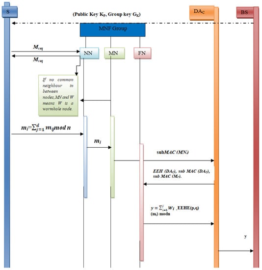 - Report Attack and Generate subMAC. An attack detection report is sent to the base station whenever a wormhole attack is detected. Now, the decision of isolation and removal is taken by the base station, which will be discussed in later sections. In order to verify the integrity of the message, a subMAC is generated by the monitoring node. This message subMAC (MNi) is sent to the DAc. Now, the end-to-end homomorphic value and subMAC EEH (DAc), subMAC (DAc), subMAC (MN) of the message are sent to the Forwarding Node (FN).