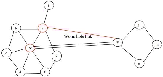 As aforementioned, wormhole deployment entails establishing a long connection across two wormhole nodes. Almost all the time, the connection is wide enough to provide the lowest pathways across two groups of potentially distant nodes. Therefore, as from the perspective of graphs, a wormhole connection yields misleading neighbouring knowledge among nodes which assume that there are k-hop peers but actually there are not. To be more precise, the wormhole link assumes that two wormhole nodes, say X and Y, are I-hop neighbours even when they are not. Furthermore, if both nodes were identified as having I-hop neighbour, as well as the network seeming highly dense, then these two particular nodes have some shared I-hop neighbour, which is not the scenario if the associated route is really a wormhole. Consider the situation represented in Figure 5, wherein node a considers node X to be a wormhole because it did not fulfil the constraints mentioned above under Equation (1). In the second scenario, as illustrated in Figure 6, the requirement is fulfilled; however, there are false positives. In the proposed protocol, the common neighbour table is created in order to detect a wormhole. Due to the overhearing property of wireless communication, common neighbours between a sender and a receiver decide whether the receiver is a wormhole or not. Thus, there is no chance of the occurrence of any false positive. In the proposed technique, the last step of the given protocol, i.e., voting, can be avoided. The proposed scheme requires less energy as compared to the protocol discussed, and there are lower chances of false positives, which will be demonstrated by experimental results in the next section.
