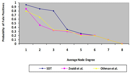 Comparison of proposed SDT protocol with existing protocol in terms of probability of false positives.
