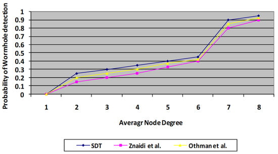The algorithm is run through its tests employing a randomized distribution. Every simulation is conducted using approximately 100 sensor nodes dispersed over a 400 * 400 m square field with just one wormhole. During every experiment, the deployed nodes maintain fixed positions. The speed protocol is applied for route tasks. Thus, node degree is taken as an important parameter for evaluation. Whenever node degree increases, the probability of false positives decreases. Whenever node degree increases, it means the number of MNF groups in a network also increases. Consequently, the monitoring mechanism by neighbours increases. Thus, the chances of false positives decrease compared with the existing scheme. A similar situation occurs in the case of the probability of wormhole detection. The findings indicate the mean of 150 cycles, having the identical connection model with randomized constructed topologies. In each test, a single wormhole threat is mounted at random, involving two nodes separated by more than four hops. With this technique, two probabilities are estimated for every set of rounds: the risk of a false positive and the chance of detection, as illustrated in Figure 7 and Figure 8, where the results of the presented protocol are proven to be better than those of the previous protocols [,].