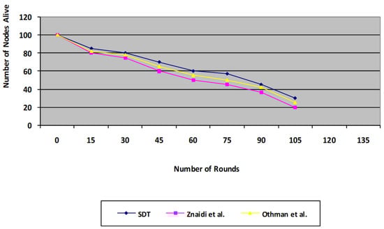 The system lifespan curve in Figure 10 additionally highlights the improvements achieved with the proposed protocol. For the 100 * 100 m network scenario model, this plot depicts the amount of nodes that remain live across a number of iterations of activity. For the recommended SDT protocol, 60% of the nodes continue living over 60 rounds, whereas 50% of the nodes remain alive for the existing protocol. Therefore, in the proposed method, 20% of the nodes remain live for 120 rounds; however, the correlation for the existing protocol was 0 live nodes, in other words, all nodes were dead for the existing protocol without aggregation at 105 rounds. Our proposed protocol is found to be more energy efficient compared with the existing protocol, as it omits the voting phase in the existing technique, which consumes a substantial amount of energy due to the number of message transfers.