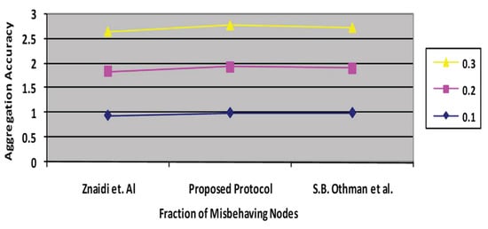 Aggregation accuracy rapidly declines as the number of malicious nodes grows. Figure 11 depicts the aggregation accuracy of the proposed approach and the existing protocol [,]. Typically, the accuracy diminishes as the proportion of malfunctioning nodes increases. The percentage of malfunctioning nodes varied from 0% to 40%. Whenever it rises, refs. [,] indicates 0.67, and the proposed protocol exhibits 0.69.