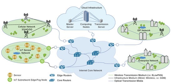 An IoT device consists of a sensing (data acquisition) unit, an actuator unit, a processing unit, a storage unit, a communication module, a power supply unit, and an energy storage system (battery). The sensors capture the desired physical data from the environment and convert them into digital information which may be partially processed by the IoT device or transmitted to fog computing servers for lightweight analysis or to a cloud computing data centre for advanced analysis. The analysis results could be returned to the IoT devices attached to actuators to control cyber–physical systems. Actuators receive digital signals and convert them into physical actions to drive or manipulate cyber–physical systems. A simplified architectural model of an IoT deployment is shown in Figure 1.