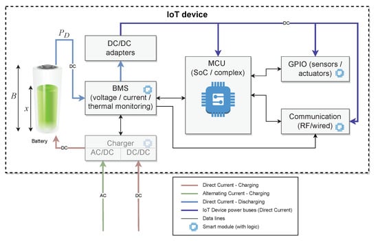 A simplified abstract architecture of an IoT device is shown in Figure 2. The core part of powering the IoT device is a BMS (battery management system) responsible for monitoring the battery state. The BMS constantly monitors voltage and current, thus calculating power drained, and monitors battery ageing via measuring remaining capacity on a charge/discharge cycle and the internal resistance and thermal profile of the battery cells. The BMS is responsible for checking critical battery conditions and informing MCU, eventually independently shutting down the power to prevent damage. This communication is bidirectional as MCU, and thus a device’s logic can monitor the current battery condition.